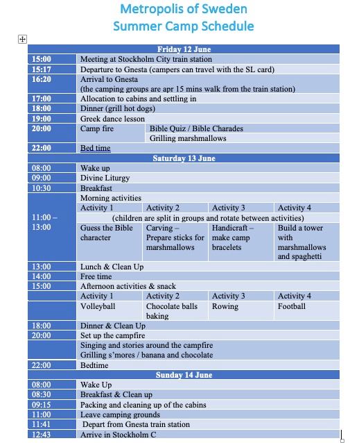 Travel to and from the camp: Campers and chaperones will meet at the Stockholm central station and will take the train to the Gnesta together (indicative camp schedule for the weekend can be found below).