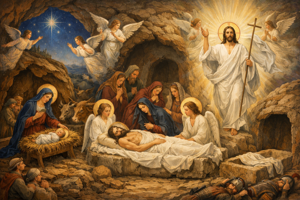 The manger, the burial shroud, and the empty Tomb are not three images; they are one truth, one unified salvific journey. Christ is born in order to die voluntarily, and He dies in order to raise humanity.